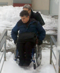 21.03.2013р. я прилетів рейсом зі Львова в аеропорт «Київ» Жуляни. До борта літака наземний трап не був поданий. На борт за мною піднялися працівники аеропорту. Салонного візка у них також не було. Вони знову брали мене один ззаду попід пахви, другий спереду попід ноги і переміщували проходом між кріслами до тамбура літака. В тамбурі мене посадили в моє крісло-візок, яке вже на той час вже там знаходилося. Добре, що при реєстрації у Львові мені надали місце в ряду, який є одразу за місцями «бізнес класу», то ж мене несли не так вже далеко. Оскільки наземного трапу до літака не було подано, то ж мене знову по хитких сходах-трапу літака разом з візком опустили на землю: один тримав за візок ззаду, другий спереду, опускаючись спиною по хитких сходах, а ще двоє стояли на землі і намагалися якось підстраховувати.